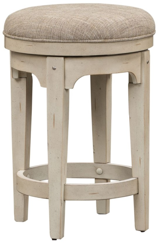 Morgan creek console swivel stools make sitting down an experience. Perfect for your guests while dining or for fun anywhere in the house. Features tapered poplar solid wood legs, pewter nail head accents and a return swivel base. Offers an upholstered padded seat in heather taupe fabric.Read More