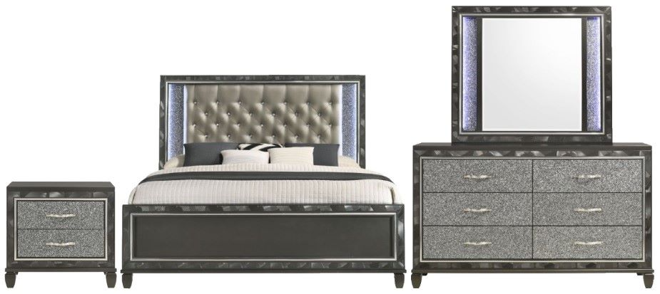 Glamorous Details: Glossy black textured black inlays, mylar trim and a crushed crystal look decorative laminate frame the plushy upholstered, crystal button tufted headboard for an eye-catching, opulent appeal